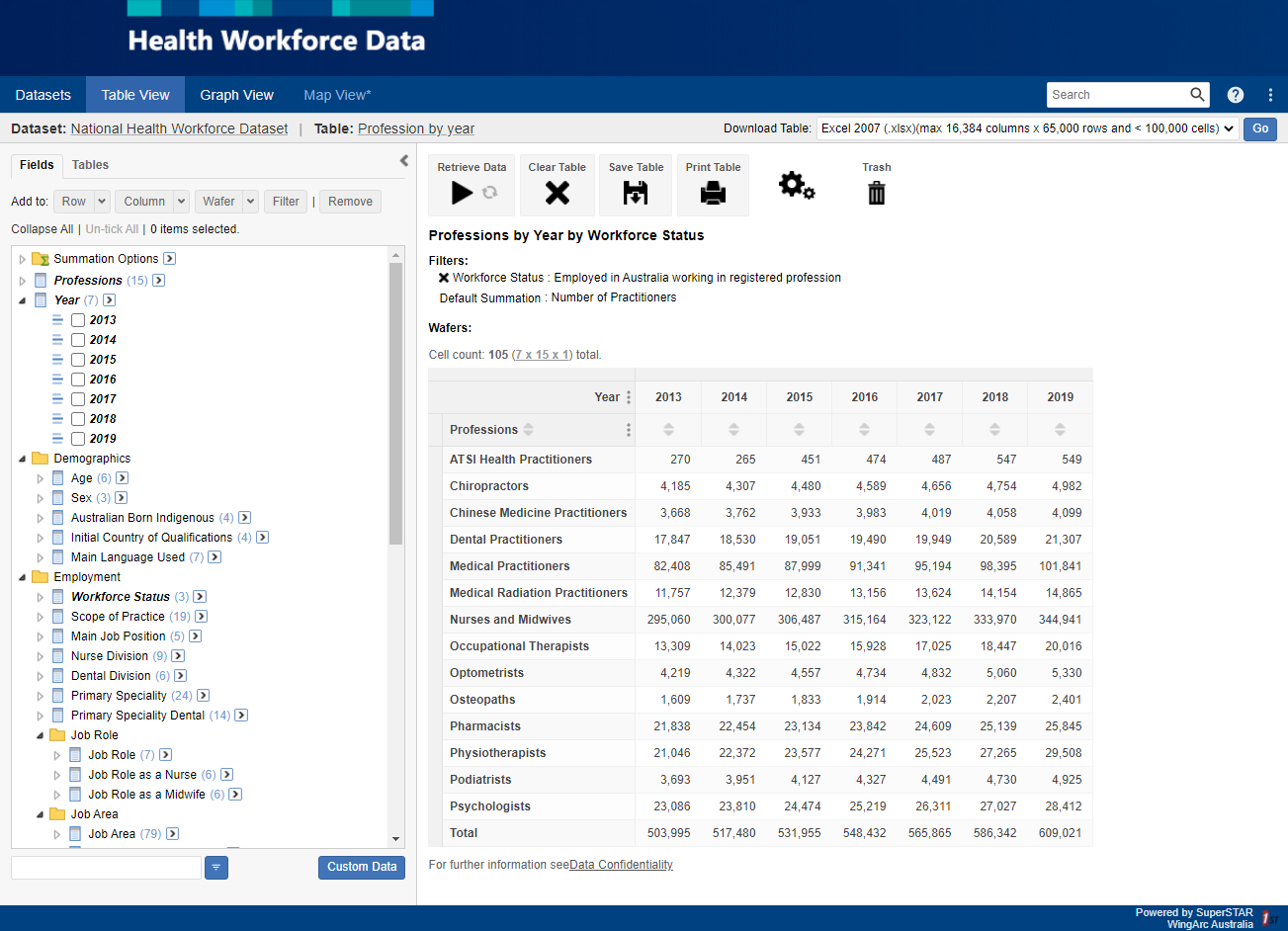 The Health Workforce Data Tool is available to the general public and allows access to different Health Workforce Datasets including the National Health Workforce Dataset. Users can build their own customised tables for different professions, geographic regions and/or different demographic and health workforce variables. Variables include:
