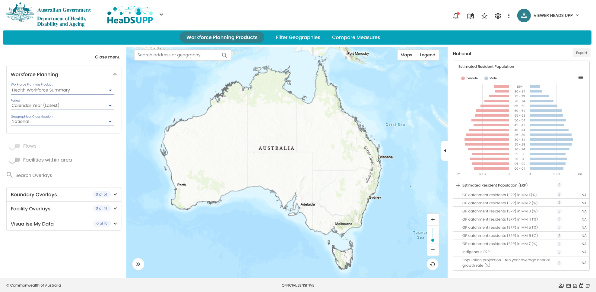 HeaDS UPP brings health data together to visually highlight how the community uses and accesses health services and the health workforce. It provides a single access point to workforce data from a number of datasets such the Medicare Benefits Schedule, Australian General Practitioner Training, Royal Flying Doctor Service Program, National Health Workforce dataset, National Health Service Directory and others.