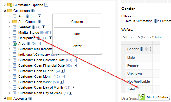 Click and drag the first field towards the table. As you start to do this, the Row, Column and Wafer options appear. Drop the field onto one of these options: