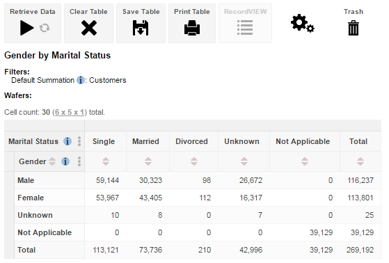 To create or update a table, select the fields you want from the list and add them to either the table rows, columns, wafers, or filters. For example (using the sample Retail Banking dataset), suppose we want to create a table with Gender in the rows and Marital Status in the columns: