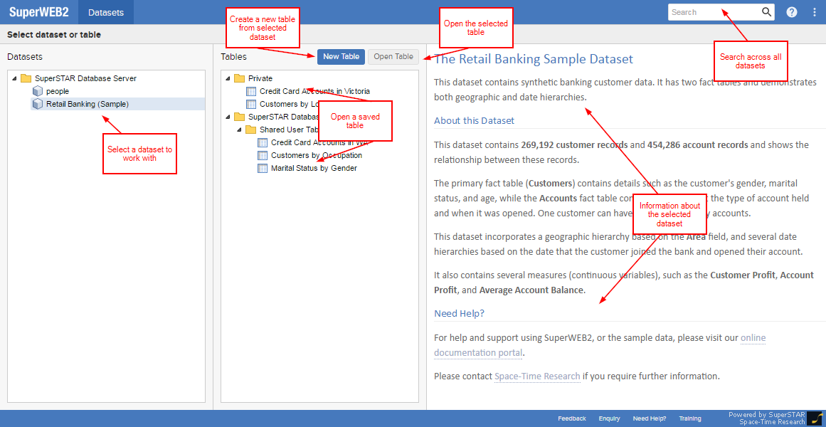 | Tables | This list shows all the saved tables for the selected dataset. The tables in the Private folder are accessible only to you. Other tables (either those you have previously created, or created by other users) may be accessible to other SuperWEB2 users, depending on how your administrator has set up the permissions. Double-click any of the tables to open them, or click New Table to start with a new, blank table. |