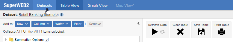 SuperWEB2 adds these values to the table:When you add the first field values to the table, SuperWEB2 also adds the default summation, so that your table has something to measure. Typically the default summation will be something like a count. For Retail Banking the default summation option is to count the number of customers.