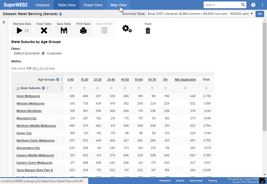If your table contains geographical data, then you can use Map View to display the results on a map. The Map View tab becomes enabled whenever you create a table containing a geographical field.
