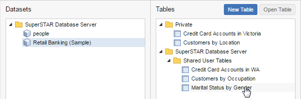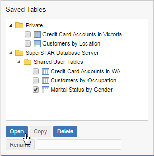 SuperWEB2 displays a list of all the saved tables you have access to for this dataset. Double-click a table to open it, or click once to select and click Open Table.